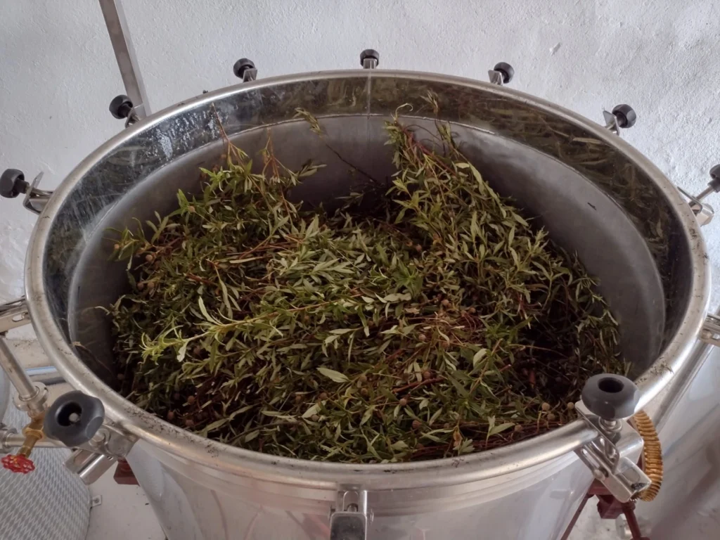 Hydrolate is extracted from rockrose with the steam distillation process. The leaves are harvested and added into a recipient. A wood fuelled boiler, produces vapor, that is directed to pass through the leaves. The hot vapour dragging essential oil and other aromatic compounds is directed to a water cooler and condenses into a recipient. Essential oil is lighter than hydrolate so we can collect both nicely separated by a gentle physical process. This process takes about 2 to 3 hours, where we collect the hydrolate continuously until the distillation is stopped, when we immediately store it in oxygen-free bag-in-box containers, preserving for long time.